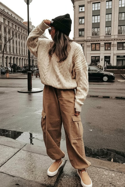 Going full tan color with cargo pants, a cozy sweater, Vans style sneakers, and a black beanie is such a mood. Monochrome outfits always look more expensive than they actually are lol. The black beanie breaks it up just enough so you don’t look too matchy-matchy. Super cute.