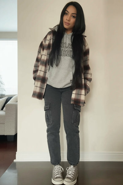 Fitted grey cargo pants with grey Converse shoes, grey hoodie and a checkered wool jacket is basically a grey lovers dream. The checkered jacket adds some visual interest so you’re not completely bland. I love how this outfit is comfortable but still has some structure to it.