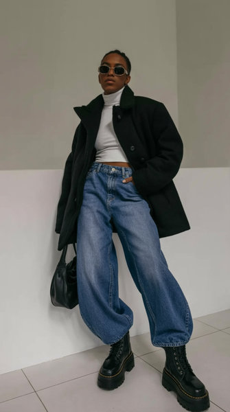 Barrel jeans can seem kinda tricky at first if you’re not used to styling them, but when you pair them with a cropped white turtleneck, warm black jacket and Doc Martens it just works so werll! The cropped turtleneck shows just a little skin which balances out all the bulkiness of the jacket and jeans. Docs are also indestructible which is great for slushy campus sidewalks.